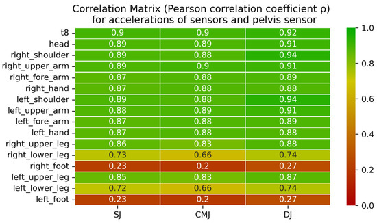 Correlation matrix for the acceleration of the pelvis sensor and one other sensor in gravitational direction for SJ, CMJ, and DJ. The values correspond to the correlation of the respective sensor combinations concerning the acceleration curves for each exercise. The color scale underlines the strength of the correlation.