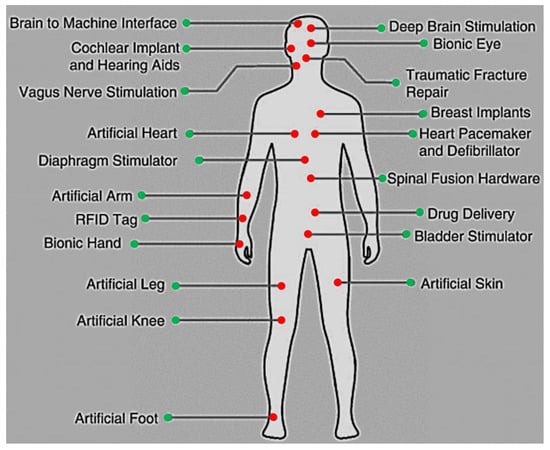 - Different Parts of Body Suitable for Implanted Devices. Available online: http://technologyandsociety.org/implantable-technology/ (accessed on 25 January 2022).