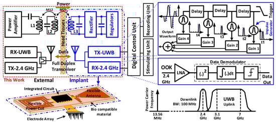 - Mirbozorgi, S.A.; Bahrami, H.; Sawan, M.; Rusch, L.A.; Gosselin, B. A Single-Chip Full-Duplex High Speed Transceiver for Multi-Site Stimulating and Recording Neural Implants. IEEE Trans. Biomed. Circuits Syst. 2016, 10, 643–653. [Google Scholar] [CrossRef]