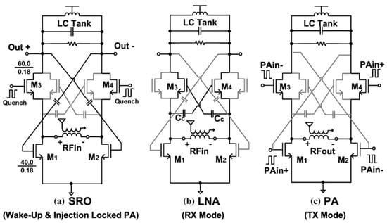 - Chiu, C.Y.; Zhang, Z.C.; Lin, T.H. Design of a 0.6-V, 429-MHz FSK Transceiver Using Q-Enhanced and Direct Power Transfer Techniques in 90-nm CMOS. IEEE J. Solid-State Circuits 2020, 55, 3024–3035. [Google Scholar] [CrossRef]