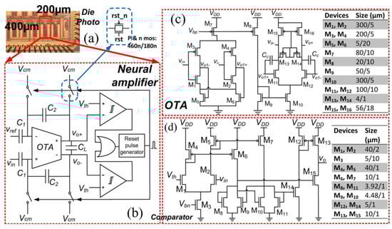 - Kim, J.; Ko, H. Self-Biased Ultralow Power Current-Reused Neural Amplifier with on-Chip Analog Spike Detections. IEEE Access 2019, 7, 109792–109803. [Google Scholar] [CrossRef]