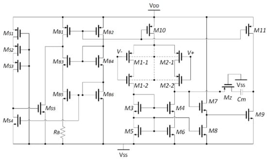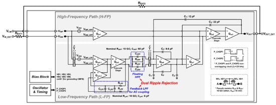 - Kim, H.; Han, K.; Kim, J.; You, D.; Heo, H.; Kwon, Y.; Kim, C.Y.; Lee, H.D.; Ko, H. Chopper-Stabilized Low-Noise Multipath Operational Amplifier With Dual Ripple Rejection Loops. IEEE Trans. Circuits Syst. II Express Briefs 2020, 67, 2427–2431. [Google Scholar] [CrossRef]