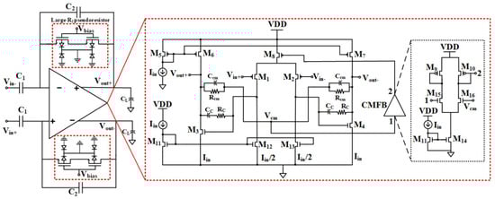 | [59] | Presents a chopper-stabilized low-noise multipath operational amplifier with dual ripple rejection loops. | Results in lower noise and a wider bandwidth. | Achieves total current consumption of 117.2 µA with 1.8 power supply, where the design is simulated in 180 nm CMOS technology. |
