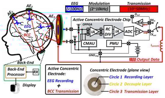 - Tang, T.; Yan, L.; Park, J.H.; Wu, H.; Zhang, L.; Li, J.; Dong, Y.; Lee, B.H.Y.; Yoo, J. An Active Concentric Electrode for Concurrent EEG Recording and Body-Coupled Communication (BCC) Data Transmission. IEEE Trans. Biomed. Circuits Syst. 2020, 14, 1253–1262. [Google Scholar] [CrossRef]