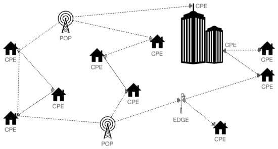 In FWA networks, internet connectivity is provided to residential and enterprise buildings via fixed wireless links, i.e., static wireless links are set up between multiple wireless devices [6]. An overview of the architecture of an FWA network is presented in Figure 1. Different types of devices are present in the network. Customer premises equipment (cpe) devices bridge the FWA network to the local area network (LAN) of the industrial or residential customer.