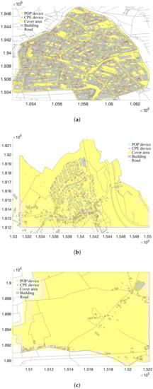 We obtained FWA network data from simulations using the green radio access network design (GRAND) tool, which is a deployment tool for wireless radio access networks [57]. The tool is designed for the network planning of cellular networks, i.e., to define base station locations considering mobile users, and has been adjusted to enable the simulation of FWA networks [58].
