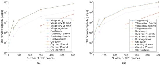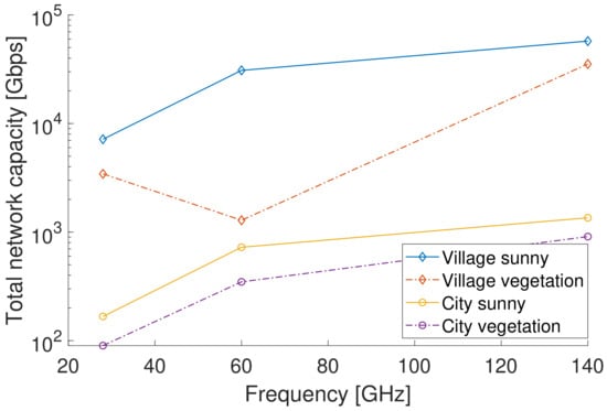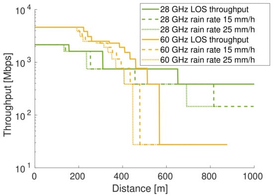 The wavelengths corresponding to mmWave frequencies range from 10.7 mm at 28 GHz to 1 mm at 300 GHz, while the diameter of raindrops is of the order of 1 to 10 mm. Therefore, electromagnetic waves incident on raindrops will suffer from attenuation and scattering, in addition to the permittivity of water, which also differs from free space [43]. As such, the received signal strength will decrease in the event of rain, causing a lower link capacity.