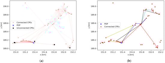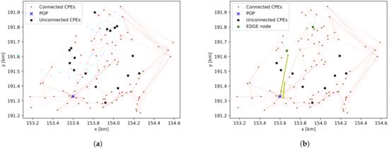 Feasibility checks were performed on the input data before running the network planning algorithm. A first check consists of verifying that the input graph is connected, i.e., there is a path from any vertex to any other vertex in the graph. If not, it is impossible to serve the unconnected cpe devices as no path towards a pop exists. A second feasibility check consists of summing the required data rates of all cpe devices and verifying that this is smaller than the sum of capacities of the links towards the artificial parent pop. If this is not the case, there is a capacity constraint at the pop devices and not all cpe devices will have their required data rate at peak moments. If one of these feasibility checks fails, a manual interaction is required, during which edge devices are added to the network, as we will describe in the next section. This manual interaction in network planning is also required to apply with (local) regulations [55]. If the capacity of the wireless links of the pop is not sufficient, additional edge devices can be added near the pop device, or additional pop devices can be added. This is again a manual decision based on the available infrastructure.