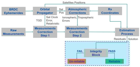 Some of the applications relying on GNSS-based timing are performed in environments where the signals are affected by errors due to multipath, fading, etc.; these phenomena could lead to large errors in the final timing solutions. In order to limit the impact of gross errors in the timing solutions, a specific block providing integrity information on the timing solution is required and is herein called the integrity block [9]. The block does not only verify if the solution is trustable but it also verifies the consistency of the whole measurement set, and eventually searches, identifies, and excludes the outliers [22]. The integrity block is integrated in the navigation solution and all the checks are performed after the estimation process, as shown in Figure 1; the light blue box includes all the additional steps needed for the integrity algorithms. In this work, three algorithms are considered for the integrity block, and the algorithms are described in the following sections.