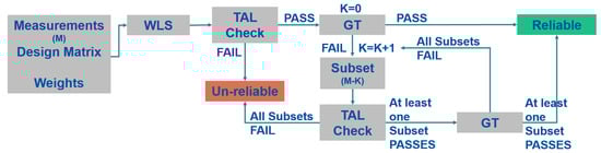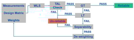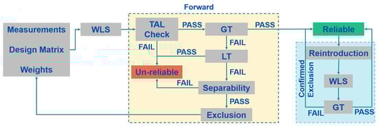 The Danish algorithm is very similar to the forward phase of the FB algorithm and it exploits the very same elements of the FB algorithm: TAL check, GT, LT, and Separability [28,29]. Between the two algorithms, two main differences can be noted: the first one is the absence of the backward phase in the Danish algorithm; the second difference is how the outlier is treated. In the Danish case, the measurement is not excluded but it is iteratively de-weighted; an extreme de-weighting of the measurement is equivalent to the measurement exclusion. In addition, for the Danish algorithm, the solution is declared unreliable for the same three cases of the FB algorithm. The processing scheme of the Danish algorithm is described in Figure 3.