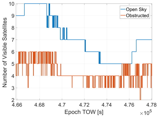 The number of visible satellites for the two datasets is shown in Figure 5. From the figure, it clearly emerges that in the obstructed scenario, the number of visible satellites is limited. In particular, after about one hour from the start of the test, only four satellites were available, hence the reliable availability of the PVT solution is limited. In the same time frame in the open sky, the number of satellites varied between 7 and 5.