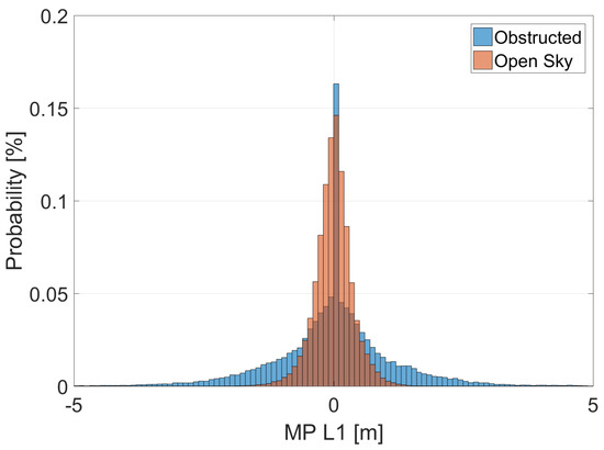 In addition to the number of satellites, the quality of the measurements is a fundamental element for the accuracy of the timing solution. To represent the different scenario conditions, the distribution of the multipath errors in the two scenarios is shown in Figure 6. From the figure, it can be noted the multipath errors are larger in the obstructed scenarios. So, the obstructed scenario is characterized by a reduced number of satellites and large errors in the measurements, making it a very challenging scenario for T-RAIM.