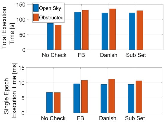 The execution time for the different algorithm is shown in Figure 7. From the figure, it can be noted that the activation of the T-RAIM leads to an increase of the execution time; without the integrity checks the baseline algorithm needs about 87 and 82 s to process the open-sky and obstructed datasets, respectively. When T-RAIM is activated, the total execution time increases up to 135 s for the Danish algorithm in obstructed conditions. Comparing the results in the two scenarios, it can be noted that in the obstructed scenario the execution time is always larger than in open-sky conditions. This is due to the higher number of outliers to be detected and mitigated. Similar results are obtained considering the single epoch execution time.