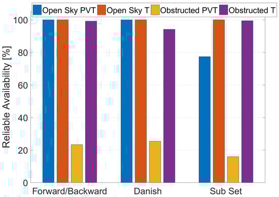 The reliable availability obtained using the three T-RAIM algorithms in the two scenarios considering the full PVT solution and the time-only solution are shown in Figure 8. From the figure, it can be noted that the lowest reliable availability is obtained in the obstructed scenario when the coordinates of the receivers are not known and a minimum of five satellites is required to perform the integrity checks. This low value is due to the limited number of satellites available in the scenario as shown in the second row of Table 2; in the same conditions, when the receiver position is known and only the timing parameters need to be estimated (only two satellites are needed for integrity checks), the reliable availability is higher than in all cases.