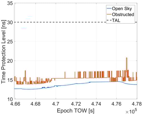 The TPLs for the two cases, obstructed and open sky, are shown in Figure 9. The blue line represents the open sky conditions; while, the red line is linked to the obstructed scenario. Finally, the TAL is the black dashed lines. From the figure, it can be noted that the red line is always higher than the blue one. This is due to the lower number of visible satellites in the obstructed scenario. Both lines are well below the TAL set to 30 ns.