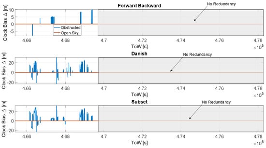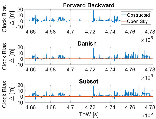 The clock bias difference as a function of the time is shown in Figure 10, considering open-sky (red lines) and obstructed (blue lines) scenarios. The full PVT strategy is sued for the clock bias estimation; in each box a T-RAIM algorithm is considered. From the figure, it clearly emerges that the limited number of available satellites limits the application of the T-RAIM algorithms and the effects are visible only in the first part of the dataset when more satellites were available. For the FB case, the maximum difference in the estimated clock bias is about 10 m (about 30 ns); for the Danish and subset case the maximum difference is about 20 m (about 60 ns).