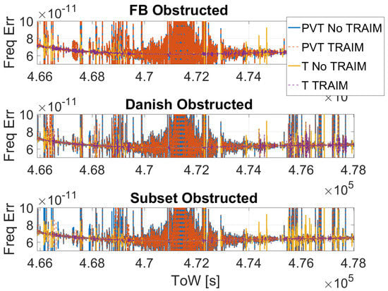 In order to evaluate the impact of the T-RAIM algorithms on the frequency error, frequency error evolution with and without T-RAIM considering full PVT and time-only strategies is shown in Figure 12. Only results for the obstructed scenario are shown because no differences can be appreciated in open-sky. From the figure, it can be noted that the configuration with the largest frequency error variations is the one using the full PVT strategy without T-RAIM (blu line). For this strategy, the activation of the T-RAIM leads to a reduction of some of the peaks in the frequency error in the first part of the dataset; comparing the blue (PVT No T-RAIM) and red-dashed (PVT T-RAIM) lines, the Danish and Subset schemes seem to be more effective for the FB in these conditions. A large reduction of the frequency error can be noted to be passing from the full PVT strategy (blue line) to the time-only solution (yellow line) but still some spikes are visible in the frequency error. The application of the T-RAIM algorithms to the time-only cases further reduced the spikes: the purple dashed line is the one with less spikes.