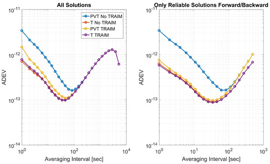 In order to evaluate the impact of the T-RAIM algorithms on the clock stability, the ADEV of the clock bias estimate with and without T-RAIM is shown in Figure 13; as the sample case, the FB algorithm is considered. In the left box, all the solutions are considered: hence, for the configurations with T-RAIM activated, the solutions flagged as unreliable are also used for the estimation of the ADEV. In the right box, only reliable solutions are considered (also for the configurations without T-RAIM). When all solutions are considered, the benefits of the T-RAIM algorithms can be appreciated only on the full PVT solution. While for the time-only case, only small differences can be noted. The curves obtained considering only reliable solutions are lower than in the case with all the solutions.