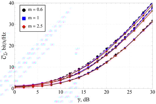 - The fading parameter m was upper-bounded by since numerous research works have demonstrated that this value can be assumed as “almost asymptotic”, which leads to the fact that its increase does not induce significant changes in the result.