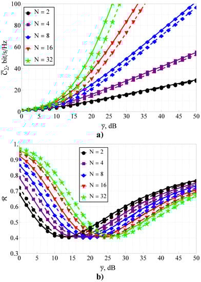 - The mean power of the received signal in the communication channel () was set to unity, since it could be efficiently recalculated into the average signal-to-noise ratio, which was swept by the range of .