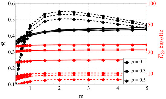 - For a small-dimensional system (e.g., ), for any correlation coefficient, there was a noticeable extremum (maximum) of the capacity reliability. For a high-dimensional MIMO system (e.g., ), was a monotonically increasing function of m.