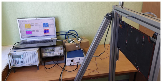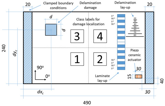 In the study, two CFRP plates (healthy and with artificial delamination) with spatial dimensions of 490 × 240 mm were considered for experimental testing and the validation of the developed concepts and methods. The staking sequence and other dimensions are presented in Figure 1.