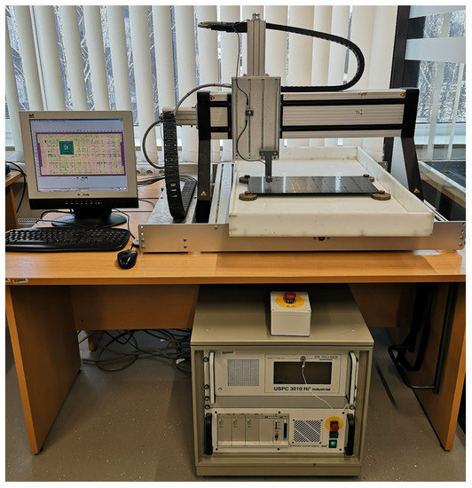 The quality of the manufactured plates and the introduced delamination damage was assessed using an ultrasonic non-destructive technique. Initial validation tests were performed using the USPC 3010 Industrial ultrasonic defect detector (Ingenieurbüro Dr. Hillger, Braunschweig, Germany). The scanner performed pulse-echo C-scans using a 10 MHz probe (broadband dual transmitting-receiving transducer with the focal length of 25.4 mm). The specimens were immersed in a water tank during testing and the scanning procedure was performed with a motor-controlled stepper XYZ manipulator that drives the probe (shown in Figure 2).