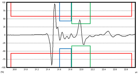 The exemplary A-scan acquired from the intact region of the tested plate is presented in Figure 3. The dedicated Hilgus software used for evaluation of scanning results makes it possible to define 3 different gates of acquiring signals. The first gate (marked with the red box in Figure 3) captures a signal reflected from the first limiting surface. When a defect in the material is present, a part of the introduced ultrasonic wave reflects from this defect and returns to the receiving transducer. Due to this, the signal is recorded as an echo of this defect, which is marked by the blue box in Figure 3. The other part of this wave propagates through the defect to the surface of a specimen opposite to the scanned surface and reflects from it. This reflection returns to the receiver with a certain delay in the form of a backwall echo (marked with the green box in Figure 3). The depth of a defect from the scanned surface is determined based on the time-of-flight principle, i.e., based on the time delay of an ultrasonic wave represented by a distance between signals in red and blue boxes.