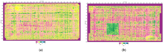 The Hilgus software provides imaging of test results in A-, B-, C-, and D-scans. A typical C-scan image combines A-scan data and is plotted on a plan view of the plate. The C-scan image for the tested plates was recorded with a resolution step of 0.5 mm on both principal axes of the plate. The results of the ultrasound imaging given in Figure 4 clearly show the difference between the two plates.