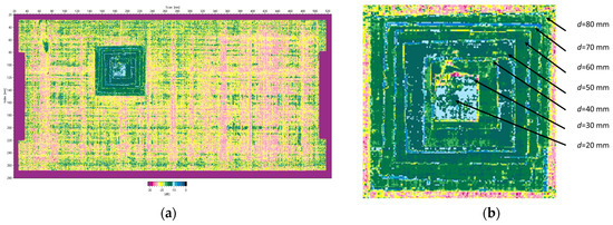 In Figure 4b, only the largest Teflon insert (d = 80 mm) is captured because it is the first limiting surface from which the ultrasonic wave is reflected. The software records this signal as the echo of the defect and also uses it to calculate the depth of the defect. To fully reveal the structure of the introduced delamination damage, the plate was scanned from the opposite side (Figure 5a). The zoomed C-scan image shows the pyramidal structure of the delamination damage and the planar size of each insert that forms it (Figure 5b).
