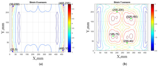 Finally, this approach was initially evaluated based on a trained, validated and tested set of classifiers prepared on the learning data set. This set was collected on the basis of developed numerical FE models of the plate for healthy and damaged conditions with different localization of the delamination. This localization was not known during the development of the sensor network apart from one sample of data for the healthy condition of the plate. A binary classifier for damage detection and multiclass classifiers for damage localization were used for this initial evaluation (see Sections 4 and 5 of [15]). Performed analysis allows the selection of k-NN classifier as the best performance classifier, robust to noisy data. Additionally, the results of the evaluation of the optimal sensor placement approach indicate that A2 and B2 are the best methods assuming that the number of sensors is not less than four sensors in both directions. These results are presented in Tables 11–14 in [15] and the discussion of these results is presented in Section 5.3 and Section 6 [15]. It is worth mentioning that previously obtained results were evaluated based on numerically derived data and this paper is aimed at the empirical evaluation of the presented approach. For that purpose, results obtained using the A2 method with four sensors in the X direction and four sensors in the Y direction with the application of seventh modes are evaluated with the data-driven experimental approach presented in this paper. This sensor network is presented in Figure 6, where Figure 6a presents the positions of sensors oriented in the X direction and Figure 6 presents the positions of sensors oriented in the Y direction. Dots in Figure 6a (blue) and 6b (green) present the localization of sensors, and the contour lines present the isolines of the sum of absolute normalized strains for seven modes in X (Figure 6a) and Y (Figure 6b) directions, correspondingly.