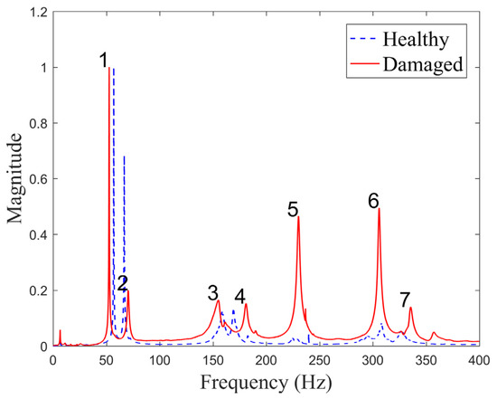 The obtained results show that the difference in the measured resonant frequencies varies in the range from −6.9% to 7.5%, suggesting that the introduced delamination has a smaller effect on the stiffness of the plate and, correspondingly, on the frequencies compared to the differences in the plates in general. The plates were produced manually in a scientific laboratory, and, thus, their consistency can be guaranteed only to a certain degree. This also suggests that natural frequencies cannot directly be used for damage identification, and other means of exploiting measured data should be sought for this purpose. Normalized frequency response functions show that the largest vibration magnitude is obtained for the first frequency for both plates. Modes 3 and 4 are in close range for both plates in terms of vibration amplitude, while other modes differ significantly.