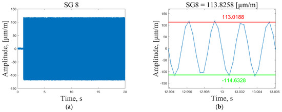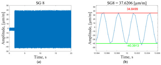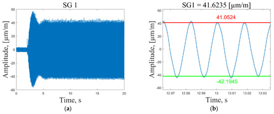 In Figure 10a and Figure 11a, one can see that at the excitation moment (time t = 2 s) there is a large spike in the strain plot, which decays in a few seconds and then the signal normalizes for the rest of the measurement time. This effect is observed only for the first resonant frequency, while for the other modes, strain measurements are in the range of peak values starting from the excitation moment (Figure 12a and Figure 13a). However, it should be noted that average peak-to-peak strain values are calculated in the period t = 8–18 s; thus, these disturbances do not affect the calculated values. Figure 11b shows a smooth sinusoidal response of strain gauge 1 to the 3 V excitation amplitude of the plate corresponding to the first resonant frequency.