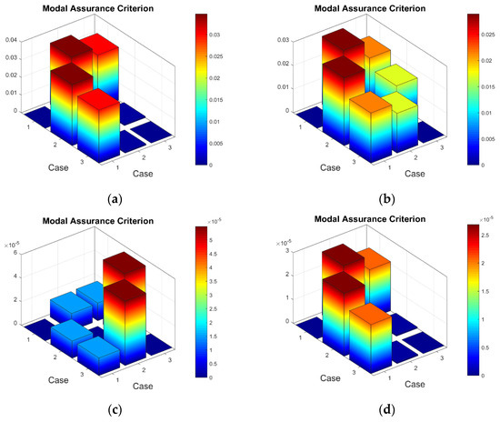 Firstly, it was of interest to compare the consistency of the measured strain data of the test plates excited by different vibration amplitudes (Appendix A, Table A1, Table A2 and Table A3). It must be noted that calculated and then scaled mean strain data for eight sensors are treated as the mode shape of a particular resonant frequency for the calculation of the MAC. The 3D MAC plots for healthy and damaged plates are given in Figure 14.