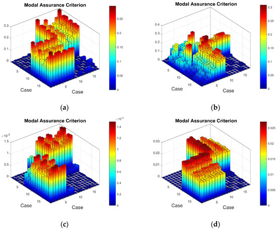 The MAC values for 18 sets of strain data: (a) healthy plate for the second resonant frequency, (b) damaged plate for the second resonant frequency, (c) healthy plate for the fifth resonant frequency, (d) damaged plate for the fifth resonant frequency.