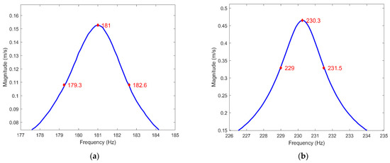 The half-bandwidth method for modal loss factor extraction for (a) the first mode and (b) the second mode (see Table 2 for details).