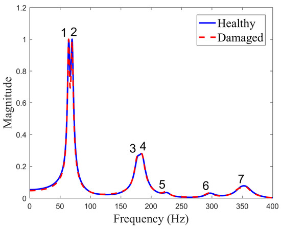 One can see that the difference in plots of FRFs is barely visible and changes in numerical values of resonant frequencies are in the range of −0.6 to 0.6%. Similar to experimental measurements, this indicates that changes in resonant frequencies may not be effectively used for damage identification in the present investigation, and other means of exploiting modal data should be sought for this purpose.