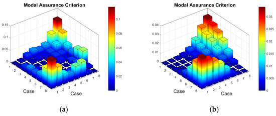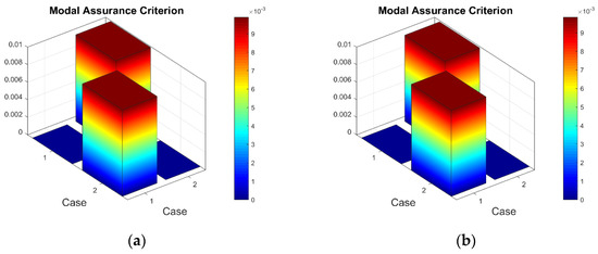 The MAC values between two conditions of the plate: (a) first resonant frequency, (b) seventh resonant frequency.