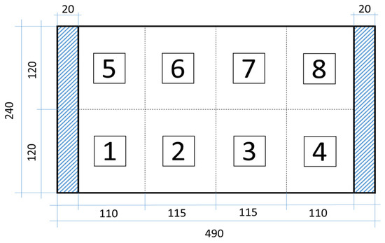 The strain measurements were recorded using the HBM® MGCplus data acquisition system manufactured by HBM (Darmstadt, Germany) and interpreted by Catman software. The present system (Figure 9) is able to simultaneously record data from eight channels with a maximum sampling frequency of 2400 Hz for each channel. To acquire compatible dynamic strain data, an equal number (4) of sensors was chosen in both principal directions of the plate. Sensors for the network were selected based on the order of the magnitude of the strain values determined by numerical analysis according to the sensor network placement shown in Figure 6. The location of the selected sensors for both plates is given in Table 1.