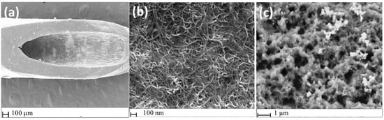 The morphology of the successful LbL fabrication of the PANI@CNT/CNC SPME MN was verified by SEM. Figure 2a shows the tip of the CNT/CNC coated MN, where the rough surface of the CNT/CNC composite coating is visible. Magnification of the CNT/CNC coated MN reveals a physically entangled porous interwoven network structure between the CNTs and CNCs (Figure 2b), held together by strong hydrogen bonding interactions. The magnified SEM image of the PANI@CNT/CNC SPME MN is shown in Figure 2c, where the rough and porous morphology of the electrically conductive PANI matrix is evident.