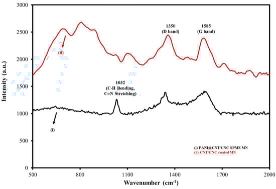 To further verify the successful LbL assembly of the PANI@CNT/CNC SPME MN, Raman spectroscopy was performed following each stage of development. Two sharp peaks at 1350 and 1585 cm−1 were observed in both CNT/CNC and PANI@CNT/CNC SPME MNs (Figure 3), corresponding to the D- and G-bands of the CNTs, respectively. The D band is generally attributed to the disordered carbon structure of the CNTs, while the G band corresponds to its C-C bond stretching [25,26,28]. The Raman spectra for the PANI@CNT/CNC SPME MN exhibited a small, sharp peak around 1032 cm−1 (Figure 3), which was attributed to both the C-H bending of the benzenoid structure, and the C=N stretching in quinoid structure of PANI [29]. Moreover, the intensity of the D- and G-band peaks decreased after fabrication of PANI (Figure 3). These results confirm the successful assembly of the PANI@CNT/CNC SPME MN. These results from characterization of the PANI@CNT/CNC SPME MN were comparable to a similar needle platform involving PANI coating reported elsewhere [26]. This attests to the reproducibility in the fabrication of the conductive polymer coatings with the PANI@CNT/CNC SPME MN platform.