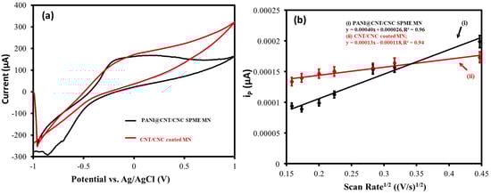(a) Representative CV scans taken at 0.10 V/s and (b) Overlapped linear plot of peak cathodic current (ip) vs. square root of scan rate for PANI@CNT/CNC SPME MN and CNT/CNC coated MN acquired in 5.0 mM K3FeCN6 (in 0.1 M KCl).