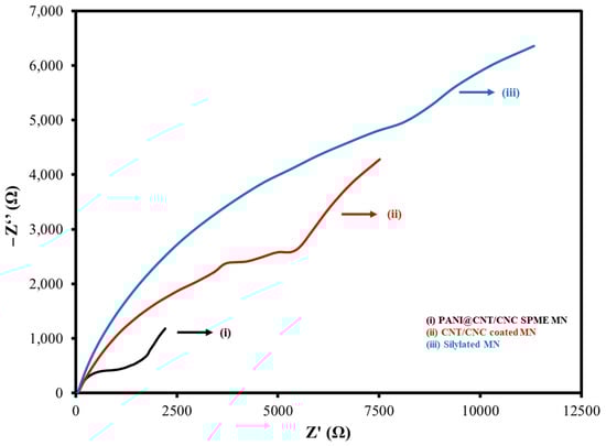 Overlaid Nyquist plots for (i) PANI@CNT/CNC SPME MN; (ii) CNT/CNC coated MN; and (iii) silylated MN taken in 25 mM K3FeCN6 (in 0.10 M KCl).