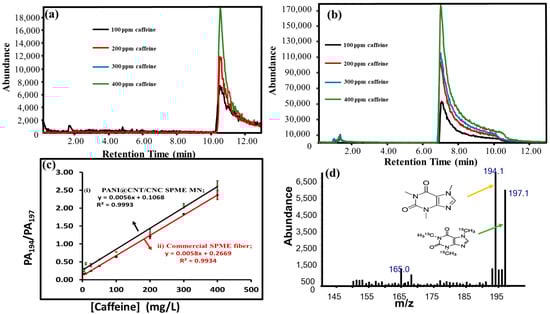 Overlaid extracted ion chromatograms (EIC) of GC-MS analysis of caffeine standards (m/z = 194 ± 0.30) acquired following SPME using the (a) PANI@CNT/CNC SPME MN and (b) commercial SPME; (c) associated caffeine concentration vs. peak area of caffeine-194/peak area of caffeine-197 (PA194/PA197) for caffeine extracted using the (i) PANI@CNT/CNC SPME MN and (ii) commercial SPME; (d) the mass spectra of extraction ion EIC for m/z 194 (caffeine standard) and m/z 197 (caffeine isotopic label internal standard) peaks.