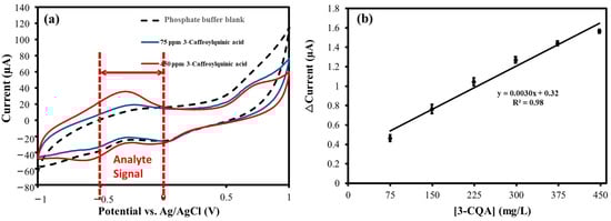 (a) Overlaid CVs obtained from the analysis of 0.10 M phosphate buffer blank, 75, and 450 mg/L 3-caffeoylquinic acid (3-CQA) (in 0.10 M phosphate buffer) taken using the PANI@CNT/CNC SPME MN. (b) Associated 3-CQA concentration vs. △Current linear plot determined by averaging the 3-CQA oxidation peak current signal in the −0.5 V–0.0 V.
