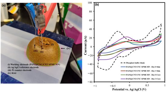 (a) Camera image of the experimental setup for in situ electrochemical kiwi analysis; (b) Overlaid CVs obtained from analysis of 0.10 M phosphate buffer blank, fresh (0-day), and 3-day ripened kiwi fruit skin and core using the PANI@CNT/CNC SPME MN.
