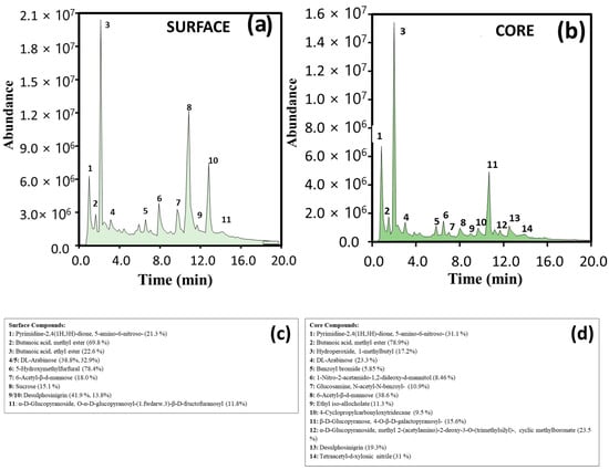 Total ion chromatograms (TICs) of GC-MS analysis of (a) kiwi surface and (b) kiwi core taken following SPME using a PANI@CNT/CNC SPME MN. Associated list of compounds found within (c) kiwi surface and (d) kiwi core deduced using the NIST library database.