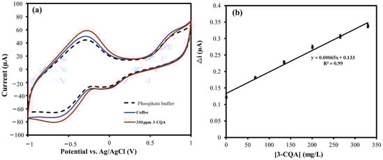 (a) Overlaid CVs obtained from the analysis of 0.10 M phosphate buffer blank, coffee (in 0.1 M phosphate buffer), and 330 mg/L 3-caffeoylquinic acid (3-CQA) (in 0.10 M phosphate buffer) taken using the PANI@CNT/CNC SPME MN. (b) Associated 3-CQA concentration vs. △Current standard addition plot.