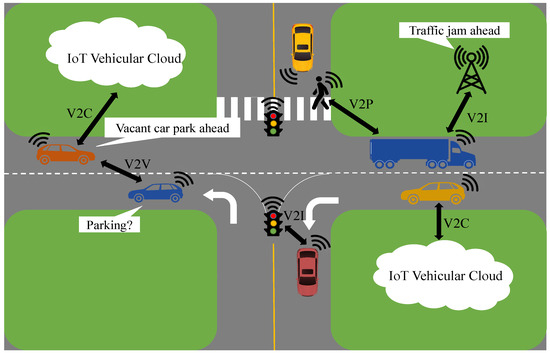 Vehicular Ad hoc Networks (VANETs), evolved from Mobile Ad hoc Networks (MANETS), play a significant role in mitigating problems associated with road traffic in urban areas. The integration of big data, cloud/edge computing and the IoT is motivating the progression of VANETs into the conception of the Internet of Vehicles (IoV) [9,10]. Intelligent vehicles linked together exploit vehicle-to-everything (V2X) communications to ensure road safety and efficient traffic flows, thus assisting cutting-edge transport and road mobility [11]. Through V2X communications, vehicles share data with one another (i.e., vehicle-to-vehicle (V2V)), infrastructure in their vicinity (i.e., vehicle-to-infrastructure (V2I)), personal devices (i.e., vehicle-to-pedestrian (V2P)), embedded sensors (i.e., vehicle-to-sensor (V2S)) and the cloud (i.e., vehicle-to-cloud (V2C)) via wireless media [12,13,14,15] as depicted in Figure 1. These communications are typically applied in (1) safety-critical application scenarios, e.g., road congestion, crash avoidance and collision notification, (2) non-safety (infotainment) application scenarios, e.g., navigation, anti-theft and entertainment [13]. Road safety and traffic management is significantly improved by combining these communications and the abilities of vehicles equipped with onboard sensors to generate obstacle, hazard, collision and congestion warnings and notifications [16]. The critical nature of vehicular applications, particularly safety-critical applications, demands safe and reliable data sharing. Nevertheless, vehicular networks are highly susceptible to both outsider attacks, wherein the adversary is not an authenticated user of the network, and insider attacks, where the attacker is a legitimate participant of the network. These vehicles with their malevolent intentions are capable of introducing unnecessary delays while forwarding, forging and/or altering safety-related information, causing accidents and endangering human lives [17,18]. An extensive study of the existing research exhibits that several solutions for vehicular network security employing cryptography have been presented. Nonetheless, cryptographic solutions on their own only address outsider attacks [19]. Lately, the paradigm of trust, which is the belief or confidence of a vehicle in another vehicle, has been applied to mitigate insider attacks [20]. Trust management schemes rely on trust attributes, i.e., features and characteristics of the network and the communication among vehicles that impact the credibility of these vehicles reflected by their respective trust scores.