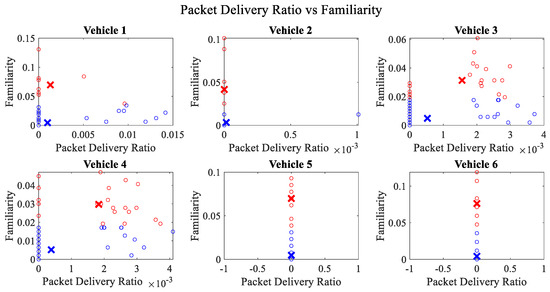 Clustering for labels using unsupervised learning for packet delivery ratio vs. familiarity for vehicles 1−6. The cluster in blue represents untrustworthy vehicles, whereas the cluster in red depicts trustworthy vehicles.